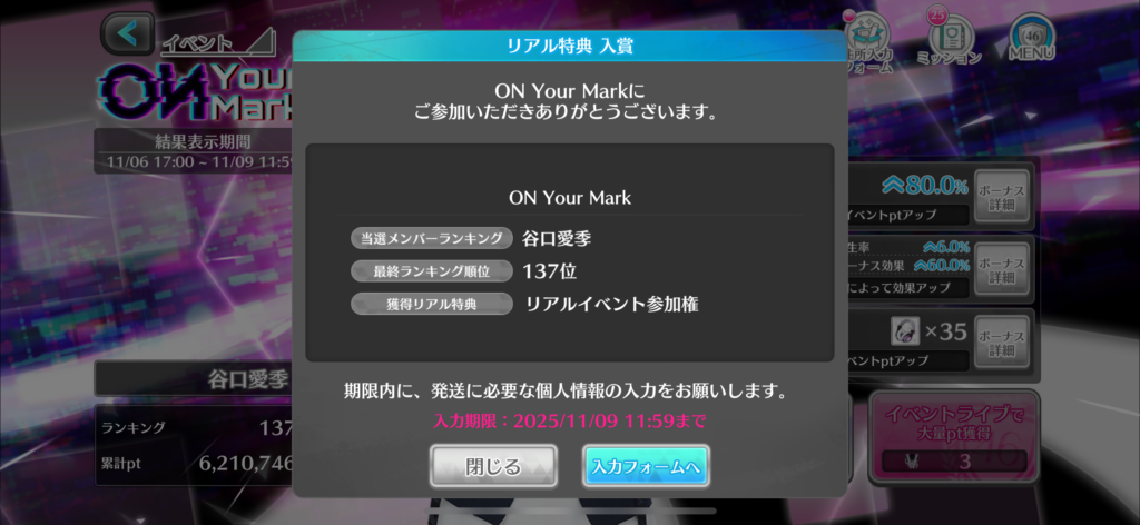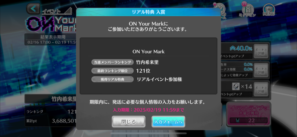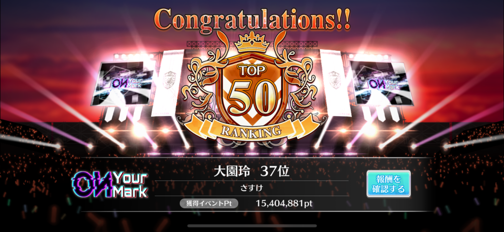 50位以内はイベント参加権確定で、51〜60位でも高確率で抽選当選する感じですが